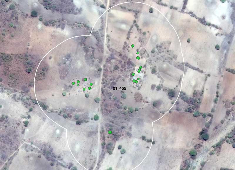 When they returned several hours later, the team reported that they had found polygon 01-455 and had sprayed all 18 structures. They also reported that the people living there were surprised because it was the first time they ever had a spray team visit their village. It was, in fact, a previously unknown settlement.