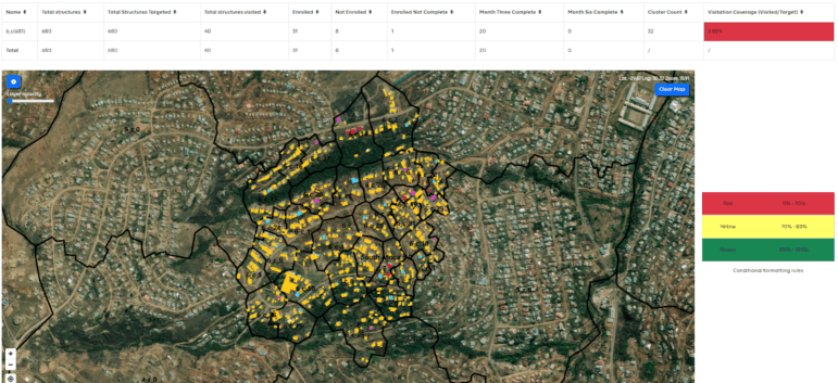 The dashboard shows that in zone 6_c, 40 structures have been visited, with 31 enrolled, 8 not enrolled, and 1 incomplete, making it crucial for supporting teams in decision-making.
