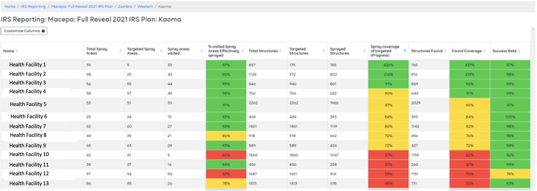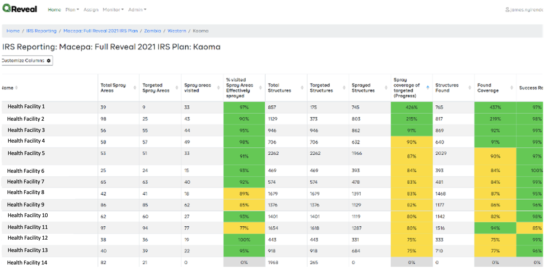 During mop-up spraying, the district team continued to monitor their spray progress in real-time using the Reveal dashboard. At the conclusion of the mop-up, just as the IRS manager had pledged during the planning stage, Kaoma District was able to change the four facilities’ dashboard color indicators from red to yellow at the end of the mop-up spraying, improving the coverage from an average of 54% to 80%.