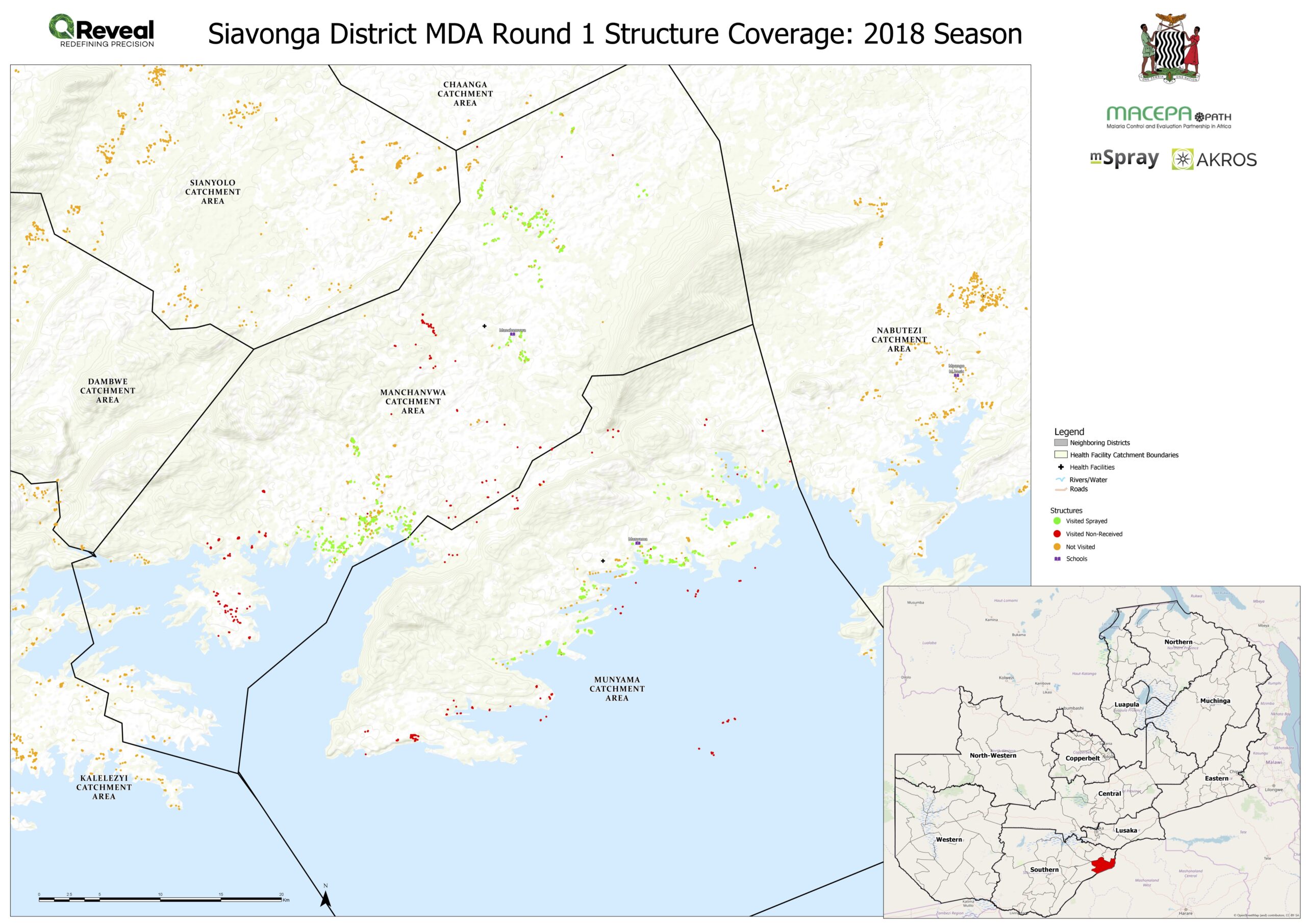 Over the last couple of years, the Government of the Republic of Zambia (GRZ), with the assistance of Akros and PATH’s Bill and Melinda Gates Foundation-funded Malaria Control and Elimination Partnership in Africa (MACEPA), have been working with the National Malaria Elimination Program district staff to overcome these numbers and improve the health of the local community by using geospatial technology to optimize indoor residual spraying (IRS) campaigns. Recently, the two organizations teamed up again to be the first to ever use Reveal’s spatial intelligence approach to maximize reach and ensure accountability in a mass drug administration (MDA) campaign that distributed antimalarials to the doorstep of each community member in three districts of Southern Province.